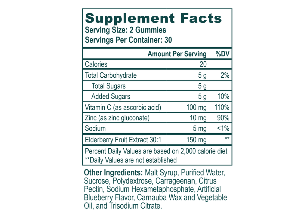Vitamin C 100mg, Zinc 10 mg, Elderberry Extract 150 mg