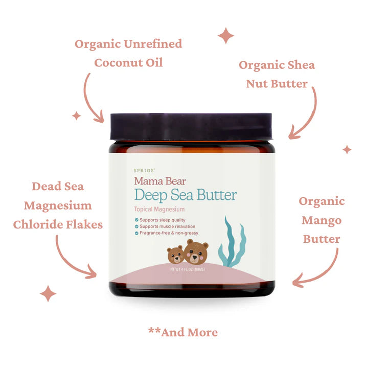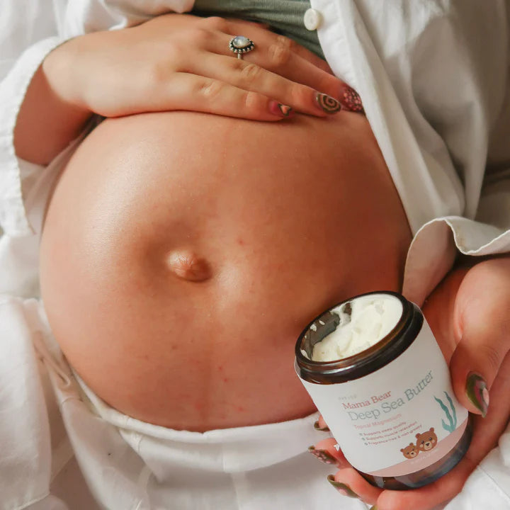 Tossing and turning, struggling to find a comfortable position, and dealing with tight legs or muscles—pregnancy can bring its fair share of struggles. Deep Sea Butter offers a targeted application of magnesium to support you on this journey and beyond. This luxurious, cream is formulated with magnesium chloride sourced from the pristine Dead Sea, along with organic mango butter, organic shea butter, and organic coconut oil. Simply massage into tired feet, legs, or even your belly to experience deep hydration, relaxation, and support for your overall well-being. Designed with moms in mind, Deep Sea Butter is a gentle and natural way to incorporate topical magnesium into your daily routine.