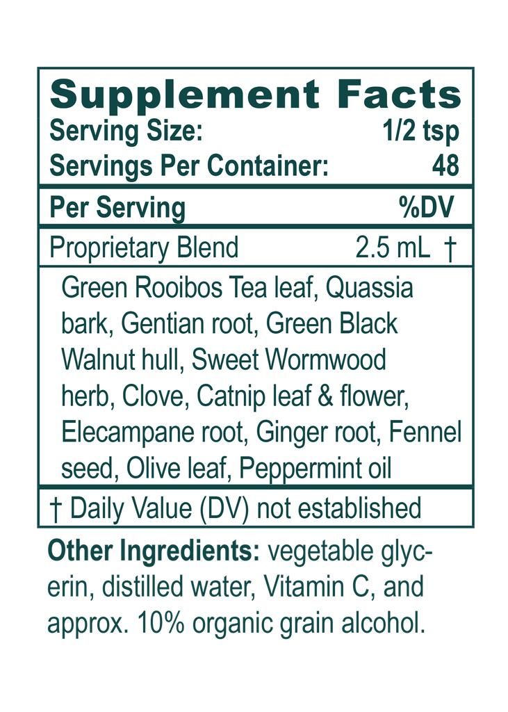 Science now confirms, when we taste something bitter, neurotransmitters are released into the nervous tissue fiber sending signals to the brain. A nerve impulse is released increasing activity in the stomach, intestines, gallbladder, and liver. Para-Rid contains extracts of the most bitter herbs known to man, along with Green Black Walnut Hull, Cloves, and Wormwood. The Catnip and Ginger help to counteract stomach Cramping, making this an ideal cleanse for children at least 2 years old.